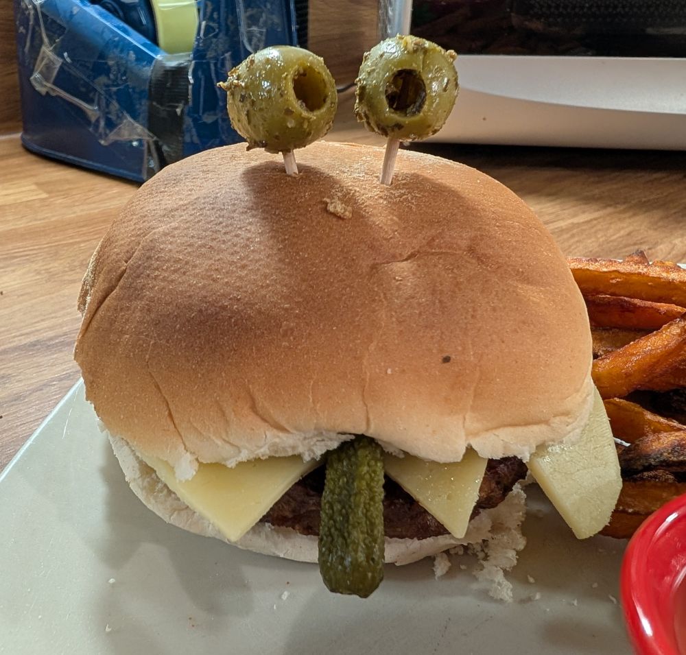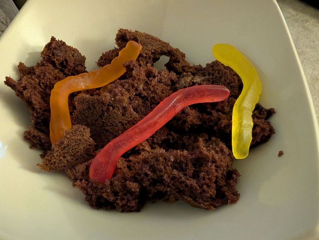 - Dinner: Plant-based burgers, sweet potato fries, spaghetti, “Worms in mud”