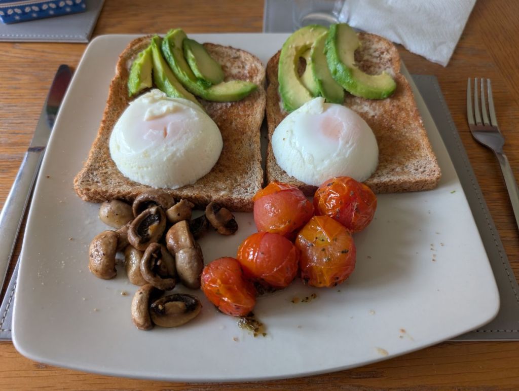 • Breakfast: Poached eggs, avocado, mushrooms, tomatoes, toast